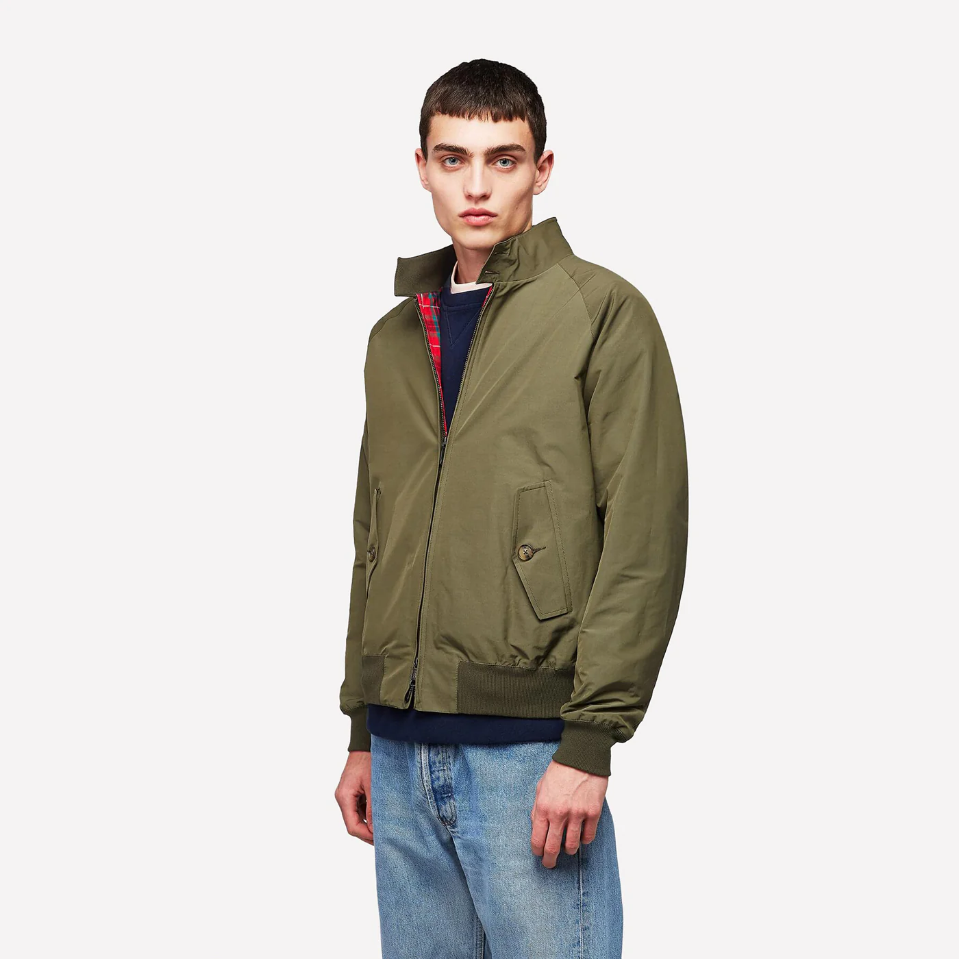 Palabras clave: chaqueta Baracuta, Harrington, G9, Army, chaqueta británica, moda sostenible, Coolmax, Fraser Tartan, ropa de hombre, impermeable.