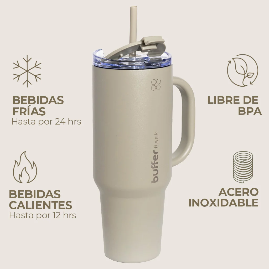Fabricada con acero inoxidable 304 de alta calidad, esta botella no solo es súper resistente y duradera, sino que también garantiza un aislamiento térmico excepcional. ¡Olvídate de las botellas de plástico y únete al movimiento eco-friendly! Nuestra Botella Térmica Mug Buffer es libre de BPA, cuidando tu salud y el planeta. Además, viene con una práctica tapa y bombilla, y es apta para el posavasos de tu coche, ¡perfecta para llevarla a todas partes!