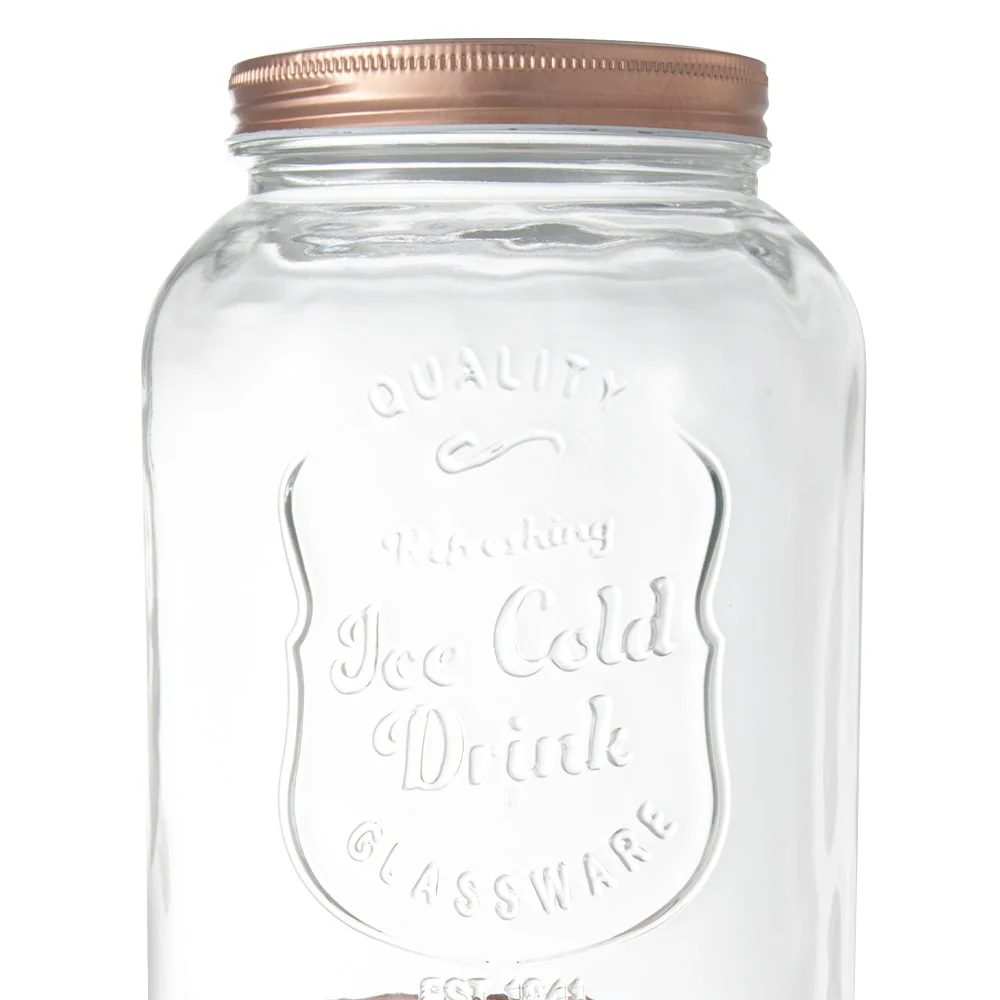 Imagina ofrecer tus creaciones en una presentación de lujo que encantará a todos. Este set incluye una jarra de vidrio de 3.3 litros con una tapa metálica rosca color cobre, un atril metálico color cobre que realza su belleza y facilita el servicio, y 4 jarras de vidrio de 500 cc con tapa rosca metálica color cobre y bombilla plástica reutilizable. ¡Todo lo que necesitas para sorprender a tus invitados!