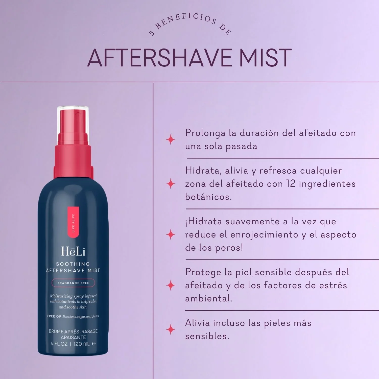 “Revive y refresca tu piel después del afeitado con nuestro innovador Soothing Aftershave Mist de la colección HēLi. Inspirado en la naturaleza, este refrescante spray es el remedio perfecto para cualquier piel sensible que busque un cuidado suave y efectivo.