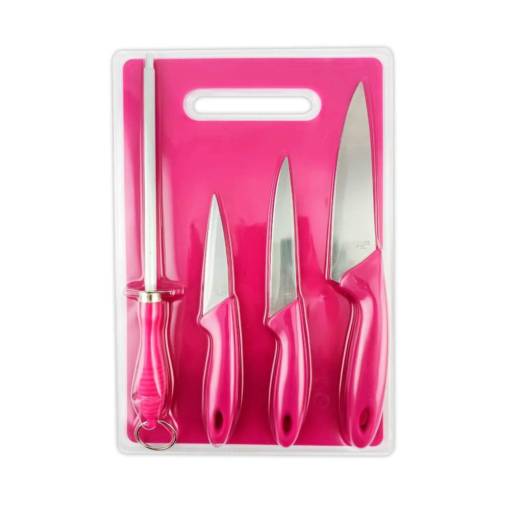 Nuestro set incluye cuchillas de acero inoxidable de alta calidad que cortan como mantequilla, un afilador para mantenerlas siempre afiladas y listas, y una práctica tabla de picar. Fabricado con materiales de plástico de alto impacto, este set está diseñado para durar. Con unas medidas de 31 cm de largo x 21 cm de ancho, la tabla es perfecta para cualquier tipo de preparación.
