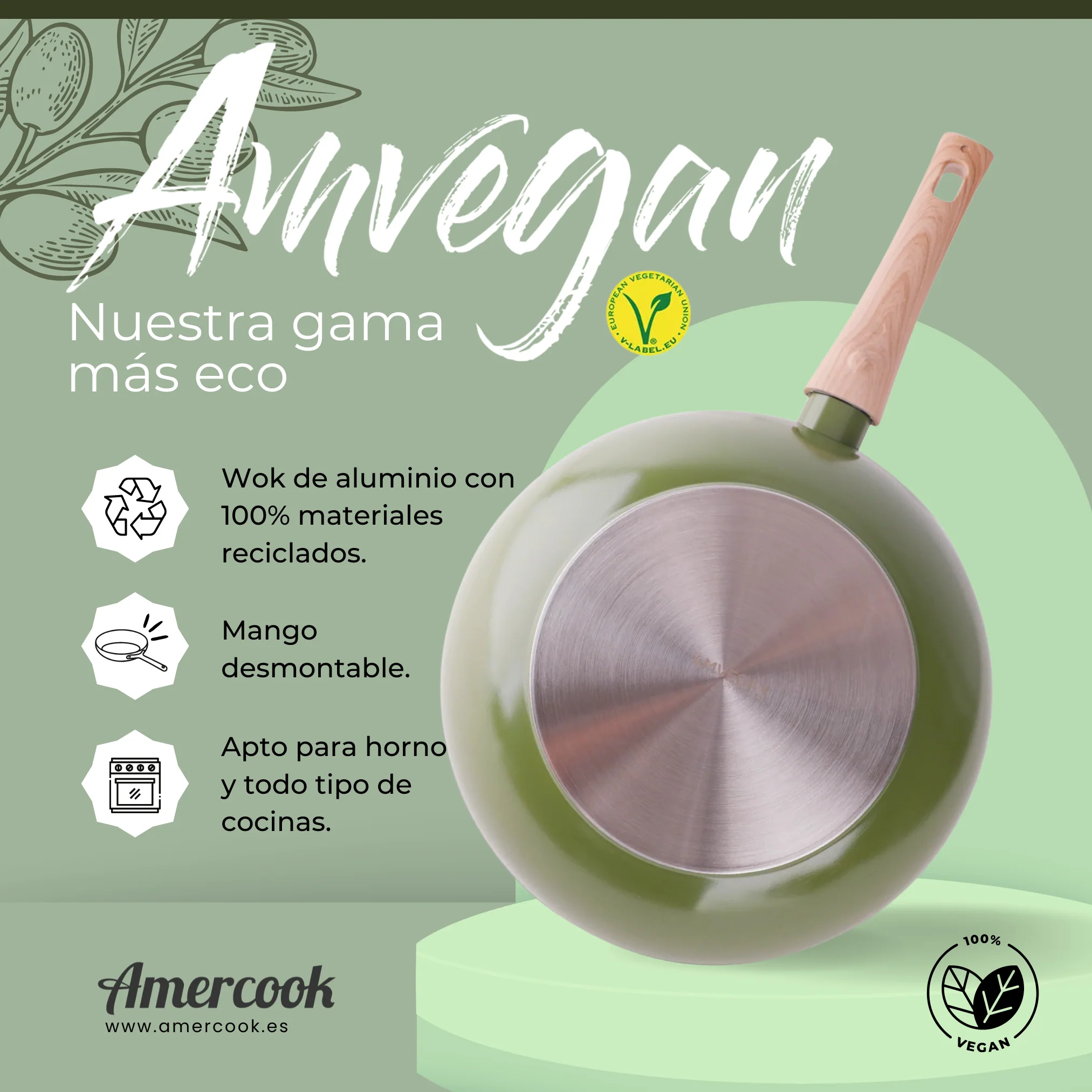 ¿Cansado de sartenes que no cumplen? El Wok AmVegan con mango desmontable es la solución perfecta para cocinar de forma saludable, fácil y respetuosa con el planeta. Fabricado con aluminio 100% reciclado, este wok no solo es bueno para ti, sino también para el medio ambiente, reduciendo las emisiones de CO2 en un 60% durante su producción.