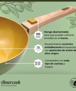 Nuestro secreto está en el revestimiento cerámico antiadherente OLIVARTE® con aceite de oliva, libre de químicos y perfecto para cocinar con menos aceite, ¡olvídate de que la comida se pegue! Además, su mango desmontable te permite usarlo en el horno y es apto para todo tipo de cocinas, incluida la inducción. ¡Imagina preparar deliciosos salteados, guisos y mucho más con la tranquilidad de saber que estás usando un producto vegano y sostenible!